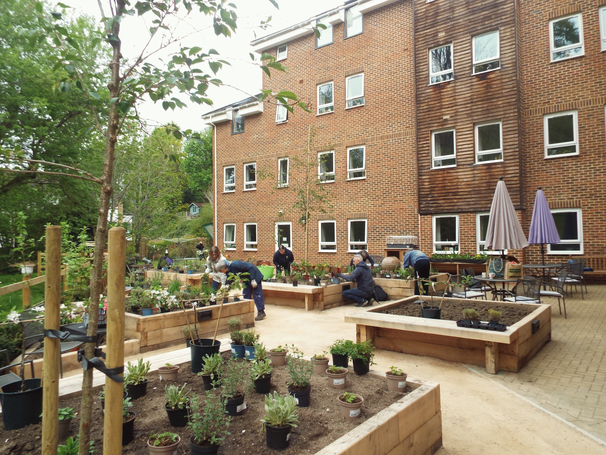 Much activity was enjoyed in the lovely new garden at Rockdale House Care Home on Thursday, 28th April, when a group of volunteers of all ages, came on site to help with the planting. The volunteers included residents’ family members, local preschool children and members of the business community, overseen by Amanda Hopkins, garden designer and her colleague, Becca.